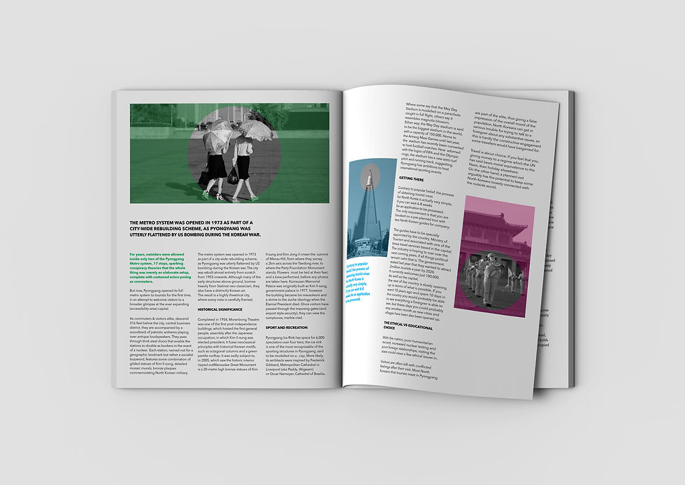Konzeption und Design eines Magazin-Covers sowie zweier Doppelseiten für Time Out. Vorgabe: Einbindung von drei bis vier Bildern sowie mindestens einer Bildbearbeitung. Das Cover musste nicht zwingend das Hauptthema (Pyongyang, Nordkorea) aufgreifen.